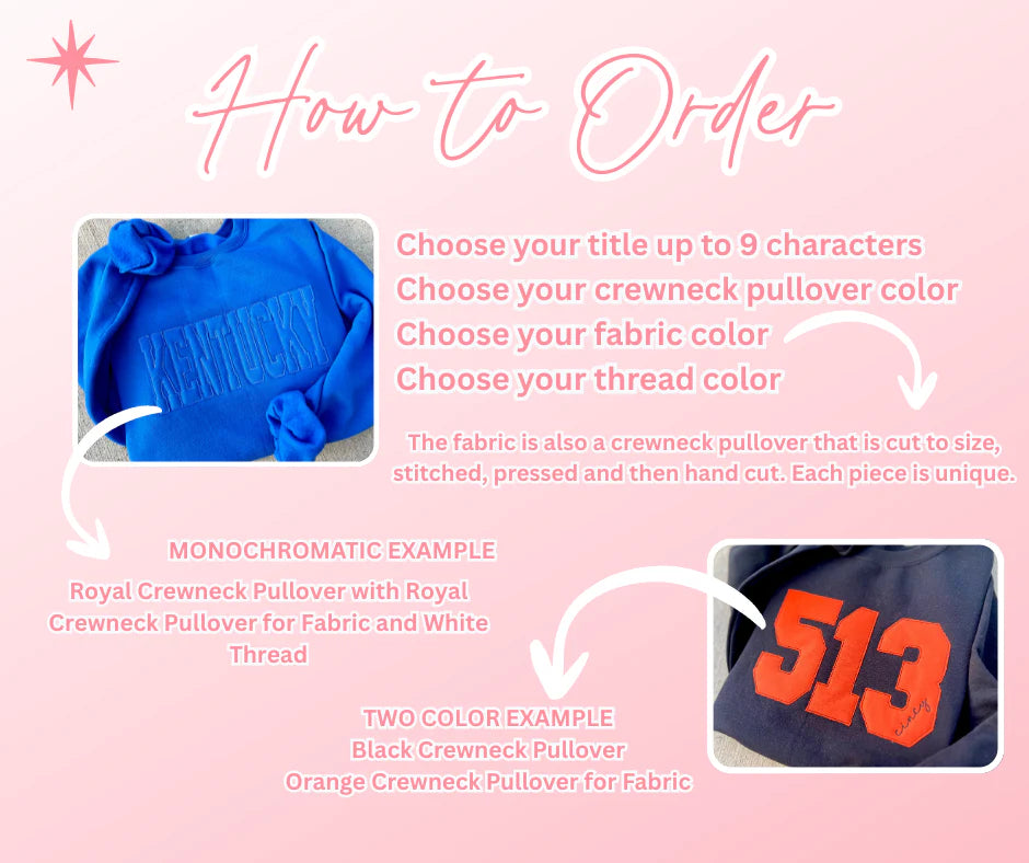 Important Information Please see production times at the top of the website in the banner. Some photos may display sayings stitched on different garment types (short sleeves, crewneck pullovers, etc.) and are intended to serve as a visual representation of design possibilities. Not all garment colors are available in every garment style, please see color charts. Please read our FAQ and Policies section prior to ordering. By ordering, you are agreeing to our policies.